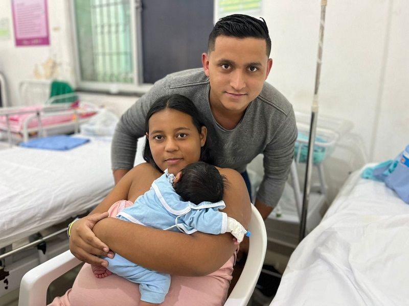 O pai Lucas da Costa está com o filho recém-nascido no hospital, e recebeu a visita das profissionais para realizar o teste.